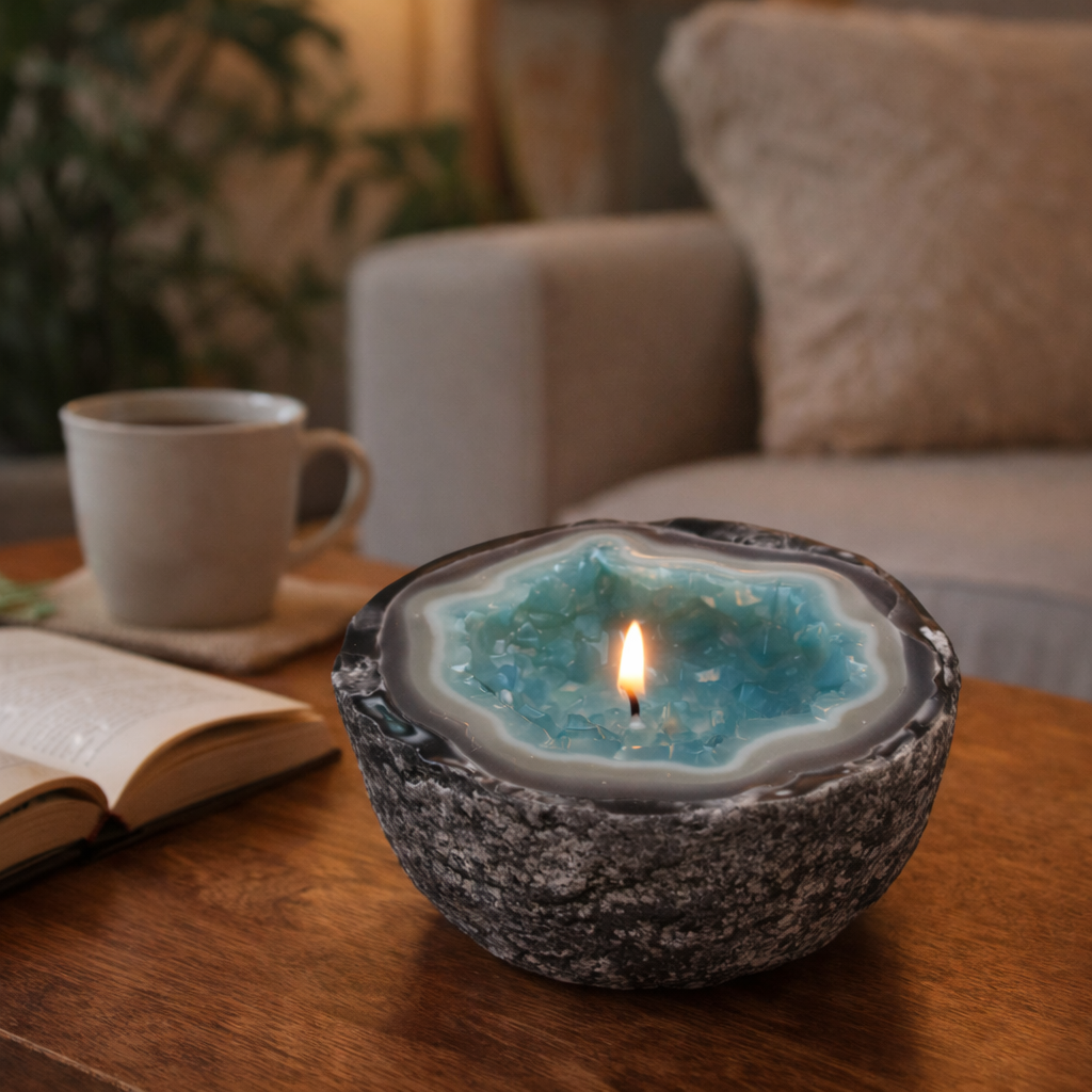 Our candle is inspired by natural geodes, combining sculptural design with a calming glow. It’s designed to be both a décor piece and a ritual for quiet moments—not just a source of light.